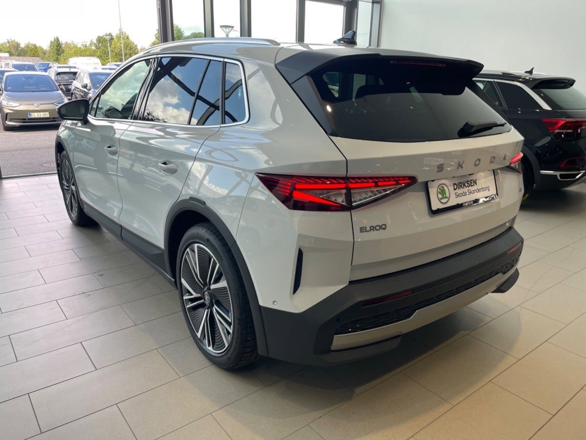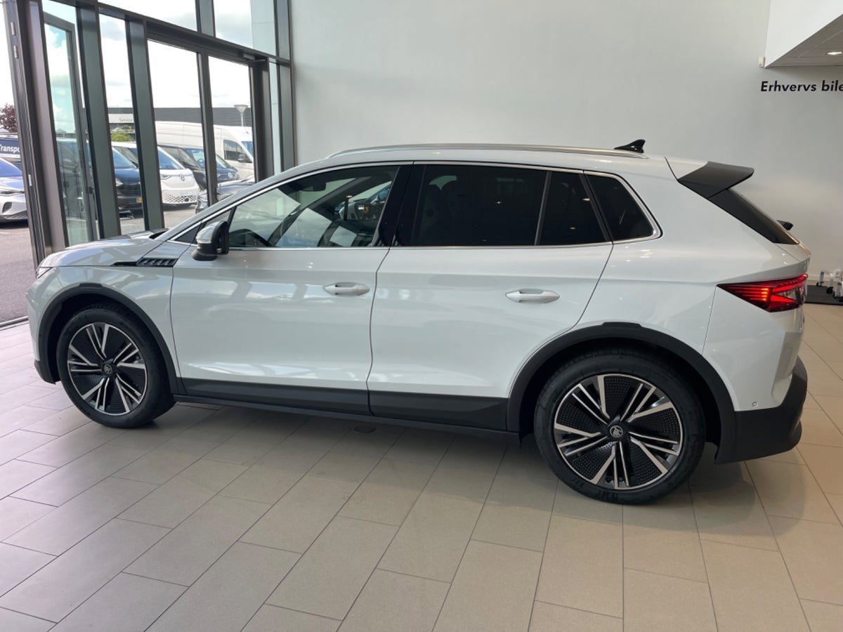 Škoda Elroq 85 fra modelår 2025. Bilen fremstår i Moon White Metallak med det stilfulde Lodge-interiør og er spækket med avanceret komfort-, sikkerheds- og teknologisk udstyr.