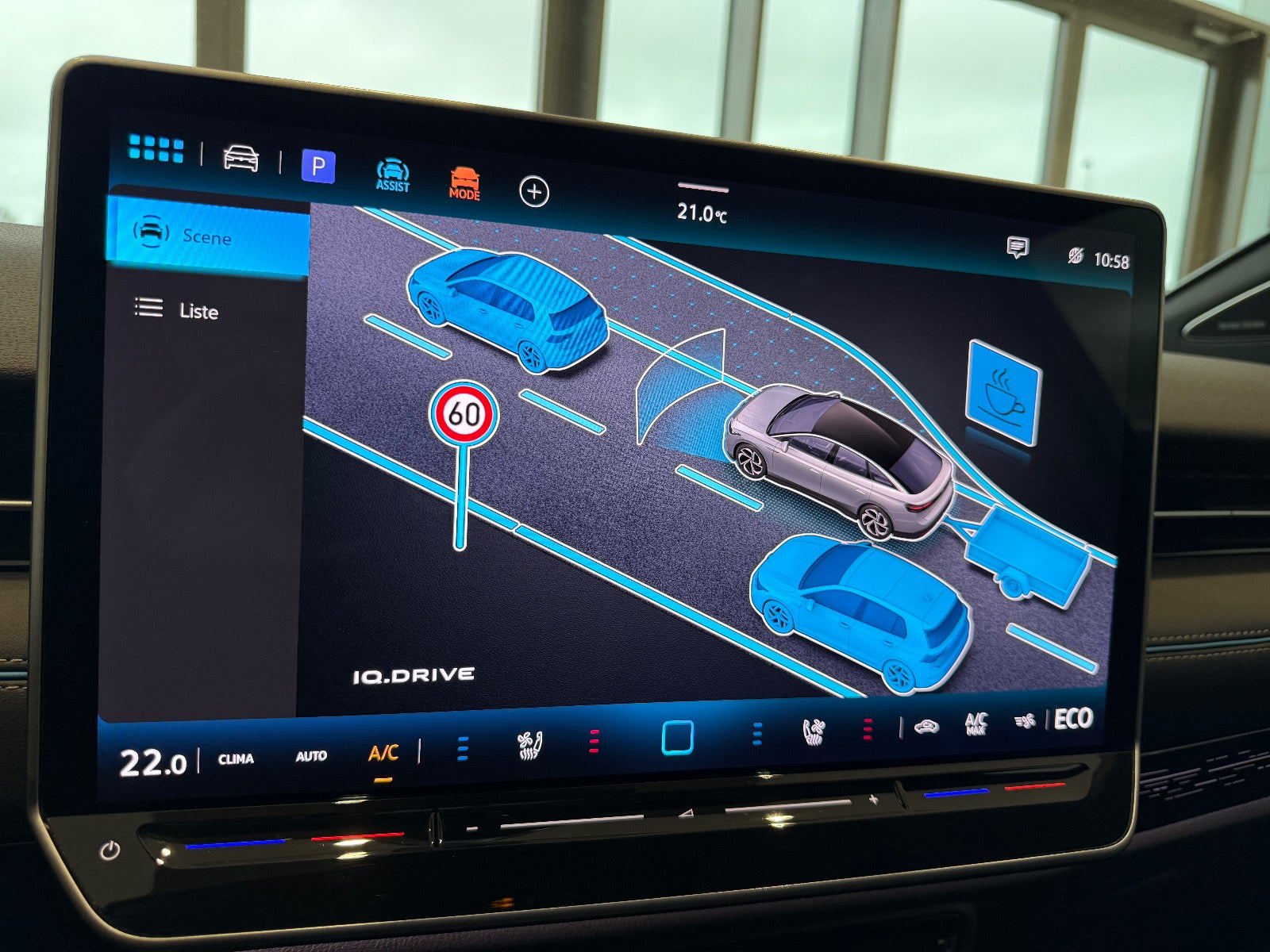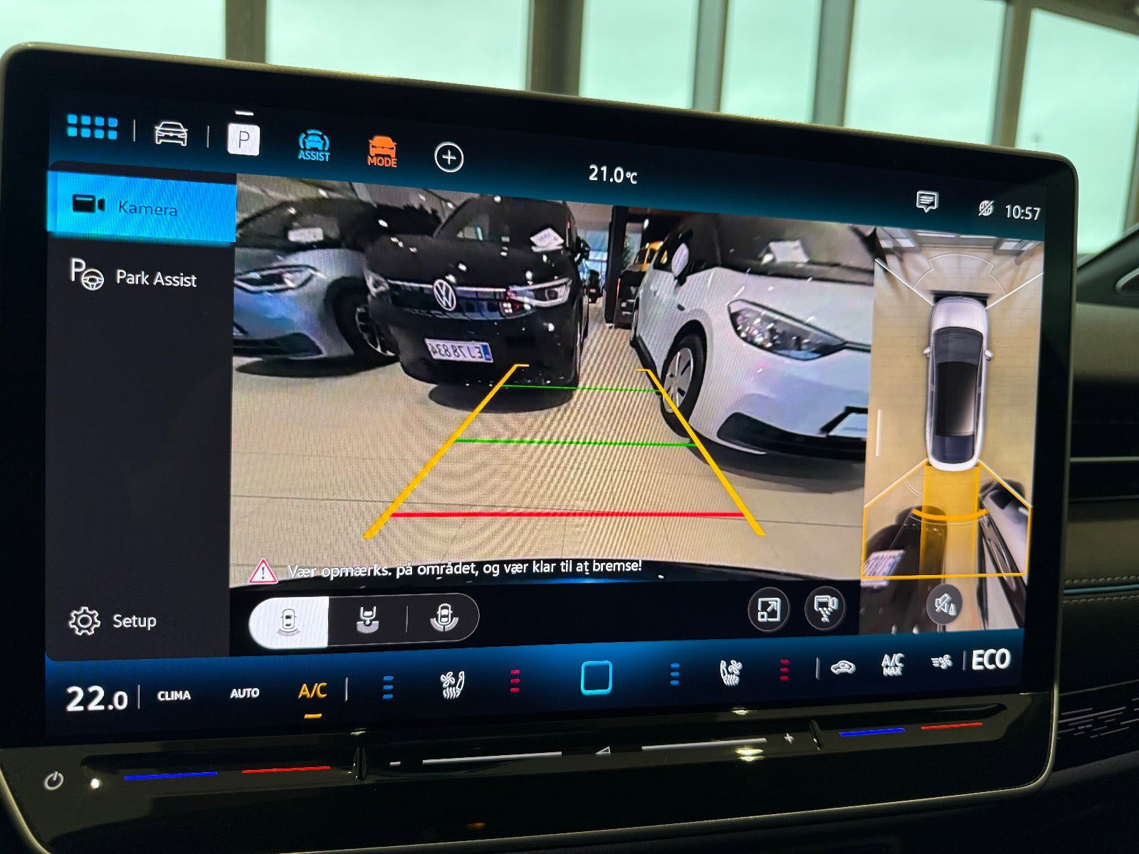 🛡️ Sikkerhed & assistentsystemer Adaptiv fartpilot (Stop & Go) Travel Assist (Lane Assist, Traffic Jam Assist, Emergency Assist) Park Assist Pro 360° kamera (Area View) Blind Spot + Rear Traffic Alert Front Assist m. fodgænger- og cykelgenkendelse Nødopkaldssystem Tyverialarm